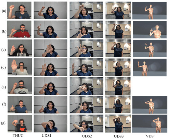 Apart from the difference in the human or humanoid, the environment of the scene, and the variations in the “correct” gestures themselves (evident through the variety of deployment of the joints of the arm, their angles with respect to the body and the camera), the difference in the sensor also leads to a covariate domain shift. Notice that the resolutions of THUC, UDS1 and 2, and UDS3 are different, although when passed through the model they would all be scaled to fit (224, 224, 3), where 3 indicates the three RGB channels. The VDS images are captured through a virtual sensor and thus are more agreeable to customized specifications that could be made closer to the original or source dataset.