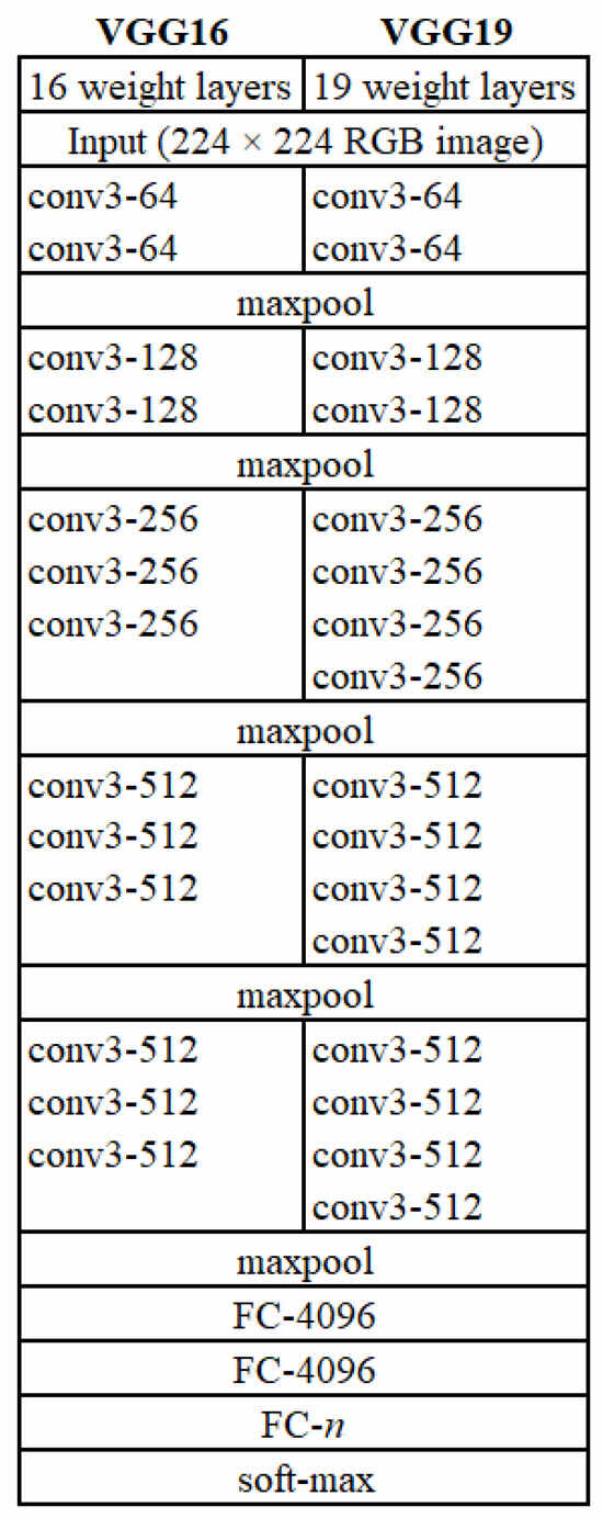 Architecture of VGG16 and VGG19 adapted from [31]. Convolution layers are followed by ReLU activations, which are not shown here. n refers to number of classes.
