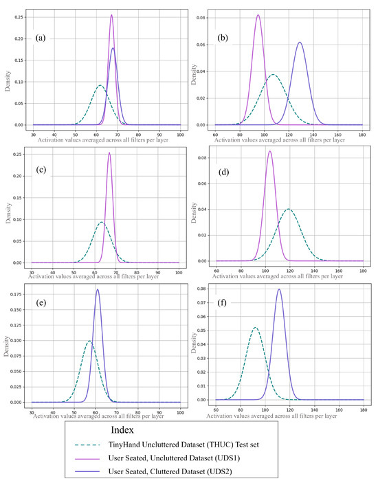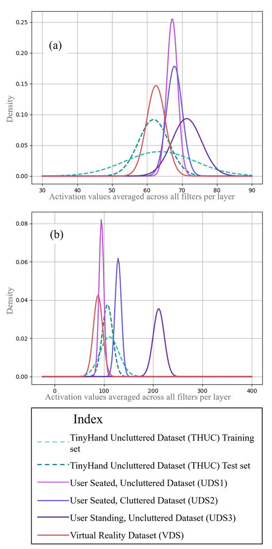 Let us try to visually examine the normal distributions of the datasets for each layer to gain an insight regarding the statistical shifts between the THUC and user datasets. The normal distributions of the activations of the second and third MaxPool layers with respect to each dataset have been plotted in Figure 4. In Figure 4a, for the second MaxPool layer, the standard deviation of the THUC training set is the largest since it contains the largest variance in data. Comparatively, the spread of the THUC test set is smaller but still larger than the shifted datasets. This is showcased in the other layer as well. UDS3 is the most dissimilar among the user datasets, and this is evident from the shape of the distribution (more variation, hence flatter and shifted mean value). Thus, as more visual variations are added to the scene, the more statistically the dataset distribution gets shifted leading to lower accuracies. Layer 3 (Figure 4b) provides the clearest indication of a covariate shift that satisfies our visual inspection hypothesis. The lower standard deviations in the user sets are also a consequence of the dataset being generated using short RGB videos and the presence of only one user. Note the different x-axis scales that have been used for better visualization. VDS in (a) and (b) appear distinct from the user datasets. Its mean value is shifted from the TH training set, and it contains more variance than the user datasets.