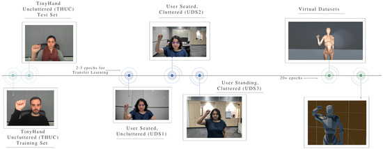 In order to simulate covariate domain shifts, three user datasets were created. These consisted of the author carrying out the seven gestures. In the first instance, the human (the author) of the scene is changed without any change in the environment. To clarify, the environment was uncluttered and a solid shade of gray similar to that of the source training set. In this dataset, the user gestured in a seated position and gestured with their right hand. This dataset is denoted by User Dataset 1 or UDS1. To simulate a change in both components of the scene, the User Dataset 2 (UDS2) consisted of the user (the author) seated in front of a cluttered background that is different from the background of THUC and also THC. Finally, to add more variations, User Dataset 3 (UDS3) had the user in a standing position in front of a cluttered background. Finally, to demonstrate a situation where the application of TL is not useful, a VEnv dataset (VDS) was also created using a skin-tone-coloured humanoid carrying out all the gestures in the above-mentioned classes, except pointer, since the “pointing” gesture is usually an in-built option in VR environments, and for the VR application, the default one was used. Figure 2 provides a sample of images from all the datasets grouped by image classes.