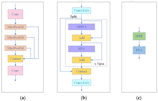 The SPPF structure is embedded in the last layer of the convolutional neural network, designed to extract richer global and multi-scale feature information. It generates a series of fixed-length feature vectors by hierarchically partitioning the input feature maps and applying different sizes of pooling kernels (5 × 5, 9 × 9 and 13 × 13) for maximum pooling. These feature vectors contain spatial information at multiple scales, which greatly enhances the model’s ability to detect targets of different sizes and scales. In addition, the SPPF structure effectively addresses the challenge of scale variation by increasing the receptive field, reducing the network parameters, and enhancing the robustness of the model to the spatial invariance of the target. The SPPF structure is shown in