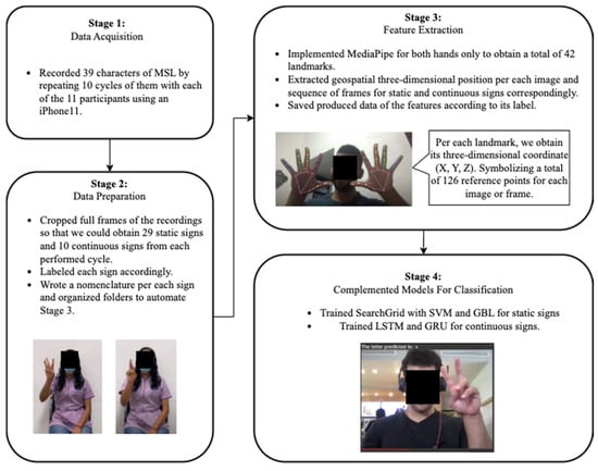 In this section, we adapted the general methodology [11] with MediaPipe since, with it, we could extract the features without preprocessing with any filters except those included within the algorithm and could later classify them (see Figure 2 and Algorithm 1).
