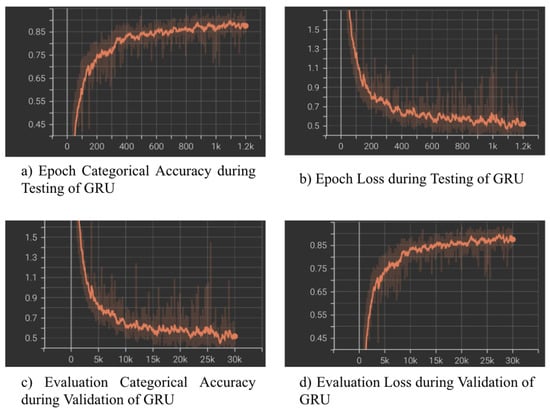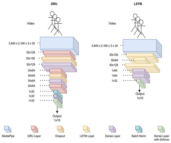 For static sign language, SVM and GBL were applied with grid search with cross validation (see Table 3). On the other hand, for continuous sign language, Tensorflow and Keras were used to apply LSTM and GRU (see Figure 4), where “he normal” initializers and “elu” activation functions were implemented instead of random initializers and “relu” activation functions correspondingly because “elu” activation function has shown a faster convergence in other studies ([51], pp. 335–338). Nonetheless, the only exception for both models was the last dense layer that used a “softmax” activation function for classification with a “glorot uniform” kernel initializer and an “L2 normalization” as a kernel regularizer. In addition, the GRU model used a Dropout of 0.2 in both layers. Moreover, the number of epochs for LSTM and GRU was 350 and 1200, respectively. Furthermore, the LSTM and GRU models had correspondingly 203,690 parameters (all trainable) and 146,602 parameters (only 62 non-trainable) (see Appendix B).