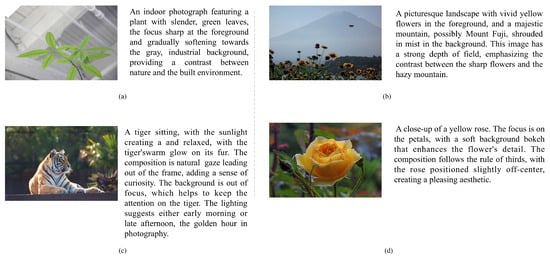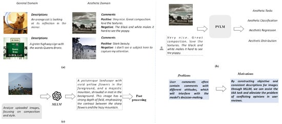- Ke, J.; Ye, K.; Yu, J.; Wu, Y.; Milanfar, P.; Yang, F. Vila: Learning image aesthetics from user comments with vision-language pretraining. In Proceedings of the IEEE/CVF Conference on Computer Vision and Pattern Recognition, Vancouver, BC, Canada, 17–24 June 2023; pp. 10041–10051. [Google Scholar]