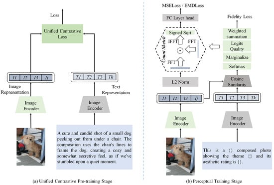 - Based on the generated aesthetic image–description pairs, we propose the use of unified learning methods to complete the unified contrastive pre-training stage of our proposed method, facilitating CLIP’s transition from the general to the aesthetics.
