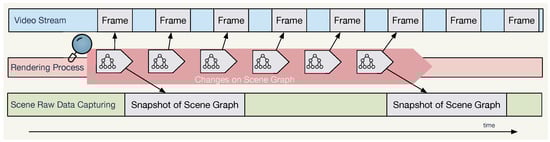 Conceptual illustration of the rendering process, resultant video stream frames, and scene graph data capturing.