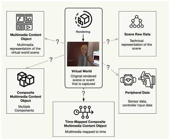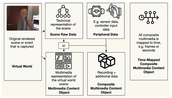 The second group, SRD, captures the visual rendering input used to create the virtual scene. This can be achieved, for example, in two ways: (1) capturing the RSG [], which represents the objects present in a scene, and (2) utilizing network codes to record inputs from other players, including avatar positions and actions. The capture process during the rendering process is visualized in Figure 1. The second method could take place on a centralized server, which relays the network-transmitted information between participants and saves the virtual world state. The resulting SRD, when combined with additional audio–visual elements such as textures and colors, offers a comprehensive view of the scene. Engage VR is a metaverse for creating virtual learning experiences [,] that allow the creation of session recordings for individuals or groups []. The recordings can be stored as a file in a proprietary and undocumented file format. The playback can be controlled in time, i.e., pause, forward, and backward, and options exist to select playback of only specific elements from the recording. However, the recording does not contain the virtual world environment, models, or other SRD, only a log of the activities of users.