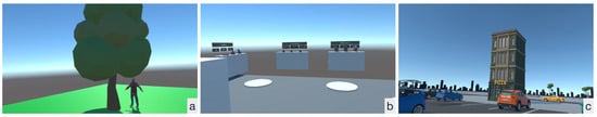 For the evaluation, a dataset comprising 111 MVRs from three distinct virtual environments was curated. Figure 4 shows the three environments: Man–Tree (a), Interaction Example (b), and an object-rich city (c). The MVRs consist of a video, a log file with extractable information, and a heart rate log file. Most of the recordings contain at least one visible object, a gesture, a trigger pressed, a player joined, or normal or high HR. The dataset and the source code are available at [] for reproduction and further experiments.