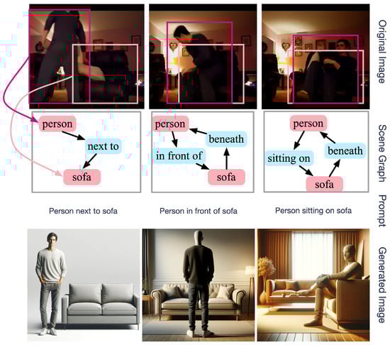 As described above, there are various methods to generate images from text and VSGs. The RSG-to-image conversion, beyond the lack of semantics, is maybe trivial. For example, when constructing the VSGs from Figure 5 as a prompt, for example, “person next to sofa”, a text-to-image model, such as Dall-E3, can produce an image containing concepts and relationships. The examples generated in Figure 5 are not identical to the original image, but considering the information given in the prompt, the resulting images are similar.