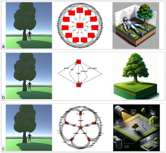 Example VSGs with different Levels of Detail derived from the original scene and generated with Dall-E3. (a) includes the full scene graph, (b) includes only the graph nodes to level 1, (c) only includes the visible graph nodes.