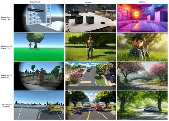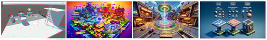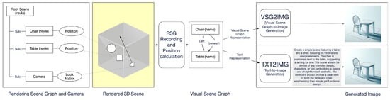 In addition to the VSG-to-image models, image generation can be performed with a textual description as input, referred to as text-to-image models. Popular models are Midjourney [], Dall-E3 [], or Stable Diffusion []. The text input can be of any form and does not necessarily require semantic relationships. However, recreating the scene in an image requires a textual description and a prompt [] including details about the scene. Obtaining exact control over the generation of images from text descriptions remains a significant challenge []. Research has been conducted to address this challenge. For example, [] attempted to gain control over positioning. Using positional information in the training of text-to-image models in prompts was explored by []. Several studies address prompt optimization. Automated prompt engineering and optimization are addressed by []. Even inferring, or hallucinating, parts of the VSG to improve the resulting quality has been researched []. Virtual metaverse worlds have different visual styles []. LLMs can generate images in different visual styles, which is also addressed in research, e.g., ref. [].