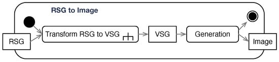 The research presented in Section 2 shows that a process is needed to solve the challenges described. The conceptual modeling of such processes is described in the following sections. As the literature research showed, at least two kinds of models can be used to generate the desired images, i.e., VSG-to-image and text-to-image models. For both options, a two-step process is required. As visualized in the activity diagram in Figure 10, the first action transforms the RSG into a VSG model and subsequently converts it into a VSG representation usable by VSG-to-image models (VSG) or an intermediate text representation, i.e., a prompt, usable by text-to-image models (VSG). The second action, Generation, executes the generation of the image. Section 3.1 and Section 3.2 describe the first action. For the second option, the VSG2IMG is described in Section 3.3 and the VSG2TXT2IMG option is described in Section 3.4.