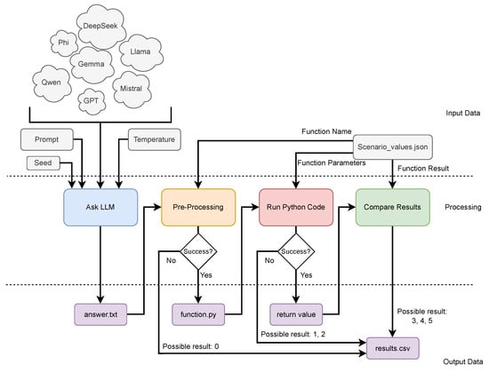 The pipeline for submitting a prompt to an LLM, obtaining a response, extracting a Python function, and executing it is illustrated in Figure 1. The process begins by iterating through a predefined set of LLMs, seeds, temperatures, and prompts. Each prompt is submitted to the corresponding LLM, and its response is stored in a text file. Next, the function from each stored response is extracted by searching for the function definition (e.g., ‘def requested_function():’) and capturing all internal code up to the last properly indented ‘return’ statement. This ensures that functions defined within the external function do not prematurely terminate the extraction. The extracted function is then recorded in a Python file for execution. If the function is not successfully extracted—such as when the defined function name does not match the expected one—this information is logged in the results file, and a score of zero is assigned for that LLM, seed, temperature, and prompt combination.
