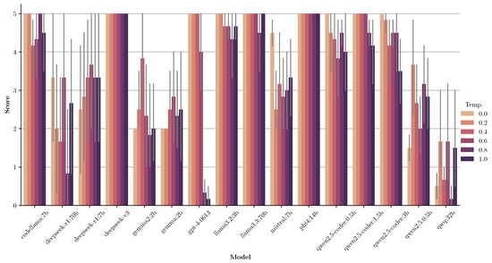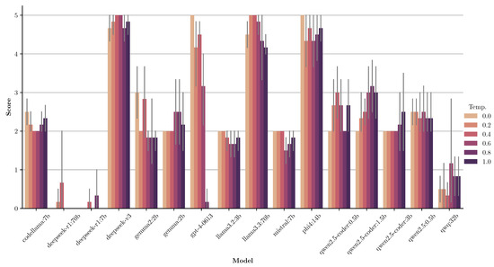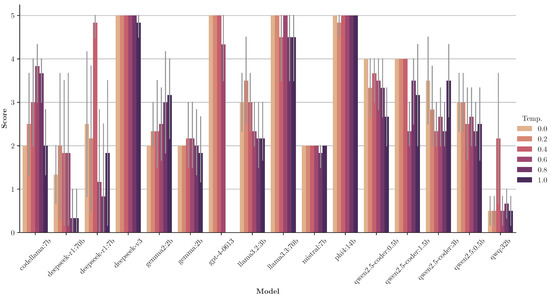 Figure 3. Prompt 2 mean answer score for the tested models over several temperatures. Each combination of model and temperature was tested with 6 different seeds. Error bars denote a 95% confidence interval. Temperatures for online models, deepseek-v3 and gpt-4-0613, are twice the displayed values.