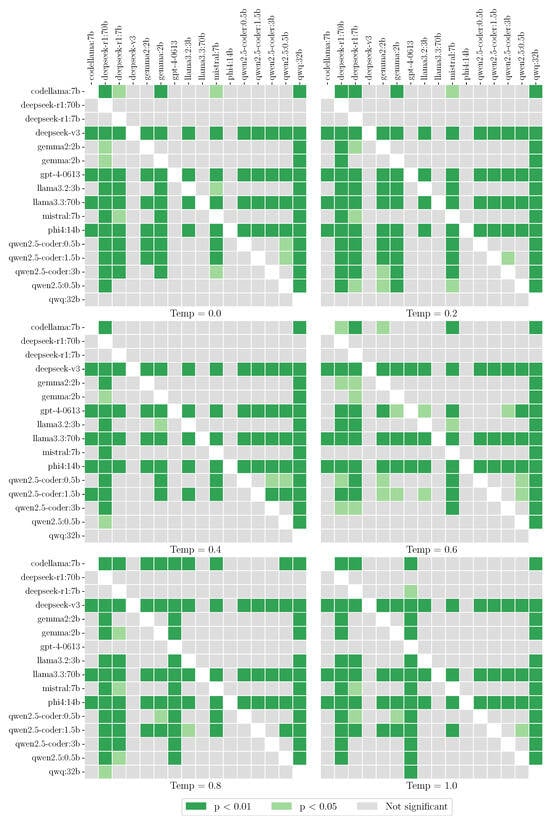 Figure 5. Pairwise significance heatmap of model performance comparisons for the three prompts across temperatures. Each colored block represents the p-value of a one-sided, rank-based stratified permutation test between two models (model in row vs. model in column) for a given temperature. Cells are colored based on statistical significance after Benjamini–Hochberg FDR multiple testing correction: dark green indicates a significant advantage of the model in the row against the model in the column ( p < 0.01 ), light green indicates moderate significant advantage ( p < 0.05 ), and light gray denotes no significant difference. Temperatures for online models, deepseek-v3 and gpt-4-0613, are twice the displayed values.