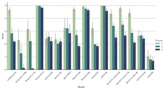 Figure 6. Mean answer score for the tested models and the three prompts. Each combination of model and prompt was tested 36 times (6 seeds × 6 temperatures). Error bars denote a 95% confidence interval.