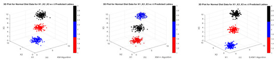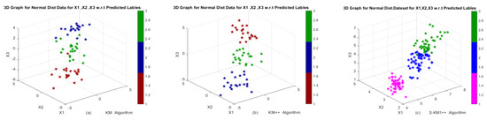 3D Graphs of the 3-cluster-simulated dataset in Example 1: (a,b) Performance of k-means, k-means++ algorithms; (c,d) Performance of S-KM1 and S-KM2 with predicted labels; (e–h) Performance of Lasso-KM1++ and Lasso-KM2++ algorithms w.r.t. actual and predicted labels, re-spectively.