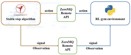 In this research, the ZeroMQ remote API is utilized adroitly to orchestrate the simulation through an external Python script (using Python v3.9 and libraries including NumPy v1.22.0). This approach is strategically chosen to take advantage of the capabilities of the Stable Baselines3 deep learning library [] (v1.7.0) in conjunction with a custom designed environment in OpenAI Gym (v0.21.0), a platform at the forefront of reinforcement learning research. The integration of the Python script with CoppeliaSim is a critical component of the study, enabling the seamless fusion of advanced machine learning methodologies with CoppeliaSim’s high-fidelity simulation capabilities. This intricate integration is further elucidated in the connection setup diagram, which provides a clear visual representation of this comprehensive and streamlined system architecture, as shown in Figure 6.