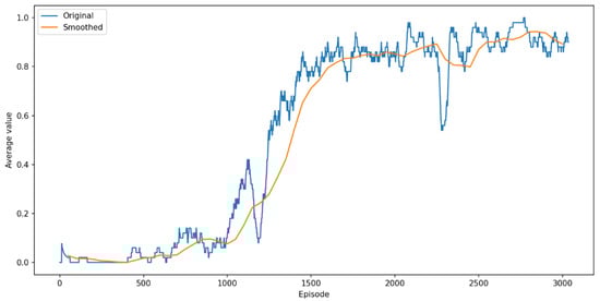 Rolling average of the agent’s stair-passing accomplishments (window size = 50 episodes). The blue line represents the original data, while the orange line shows the smoothed trend.