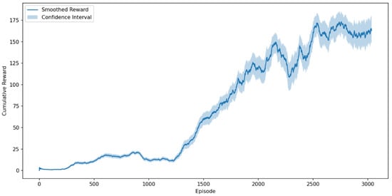 The cumulative reward smoothed graph, and its confidence interval are shown in Figure 9. This graph presents the rolling average of the cumulative reward per episode, with a window size of 100 episodes, along with a 95% confidence interval.