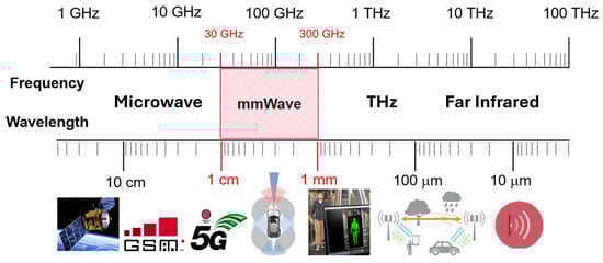 mmWave technology is not limited to wireless communications. It has already been used in automotive radars available on the market since the end of the last century [3,4,5]. Its location in the electromagnetic spectrum is shown in Figure 1. Thanks to affordable chip technology and enhanced reliability, mmWave radar sensors have become increasingly popular for civilian uses [6], such as detecting obstacles [7], recognizing motions [8], pinpointing locations [9], tracking objects [10], etc. mmWave radar technology has gained significant traction and popularity, as mmWave can achieve higher resolution due to its shorter wavelengths compared to conventional radio-frequency (RF) radars. This allows for detailed detection and imaging of objects, which is crucial for applications requiring precise spatial information, such as autonomous vehicles and advanced driver assistance systems (ADAS) [11,12]. The exploration of mmWave technologies is essential for advancing vehicular communication systems, which may yield a solution to the increasing demand for high data rates and reliable connectivity in autonomous driving and vehicle-to-everything (V2X) communications [13,14].