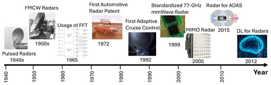 To provide context for the recent advancements in millimeter-wave radar systems, particularly in automotive applications, Figure 2 illustrates a timeline of key historical milestones in radar technology. Beginning with the introduction of pulsed radars in the 1940s, the field progressed with the invention of FMCW radar in the 1950s, followed by the adoption of fast Fourier transform (FFT) techniques in the 1960s, which enabled more efficient spectral analysis. The first automotive radar patent was filed in 1972, laying the foundation for vehicular applications. Notable milestones also include the introduction of adaptive cruise control in 1992, the standardization of 77 GHz mmWave radar in 1999, and the emergence of MIMO radar systems in the early 2000s, which significantly improved spatial resolution. By 2012, radar had become central to ADAS, and by 2015, commercial deployment accelerated. More recently, deep learning techniques have been applied to radar signal processing, marking a shift toward intelligent and adaptive radar systems.