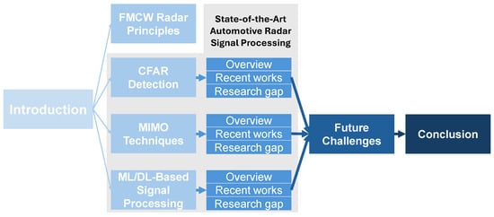 This review paper is organized as follows: Section 2 outlines the motivation for this review, emphasizing the rapid advancements in mmWave radar technologies and their transformative applications across industries, particularly in the automotive sector. It shows the evolution of radar systems, the integration of cutting-edge signal processing techniques, and the importance of multi-sensor fusion in enabling precise environmental perception. Section 4 provides a comprehensive overview of state-of-the-art automotive radar signal processing methodologies, including discussions on frequency-modulated continuous wave (FMCW) radar, constant false alarm rate (CFAR) detection, MIMO techniques, and machine learning-based signal processing. Section 5 explains the challenges faced by mmWave radar systems, such as environmental interference, high-frequency limitations, and the need for seamless sensor integration. Lastly, the last section concludes this paper by summarizing the critical insights, discussing the broader implications of mmWave radar in autonomous systems, and identifying future research directions to address current limitations and optimize performance. The flow of this review is given in Figure 3.