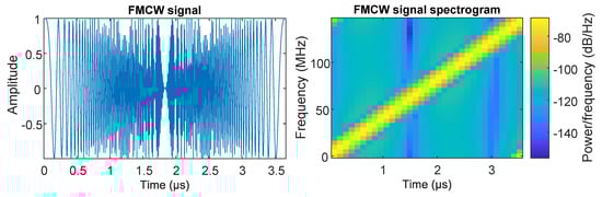 The FMCW radar continuously emits a signal whose frequency is linearly dependent over time in one cycle, which is called “chirping”. An example is given, where the time-domain signal and its spectrogram are shown in Figure 4.