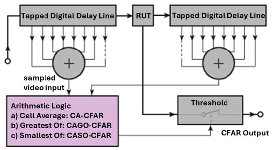 In Equation (11), denotes the desired false alarm rate. The algorithm of CFAR has variations, where cell-averaging greatest of-CFAR [38], cell-averaging smallest Of-CFAR [39], ordered statistic-CFAR [40], and cell-averaging statistic Hofele-CFAR [41] were implemented in the last three decades.