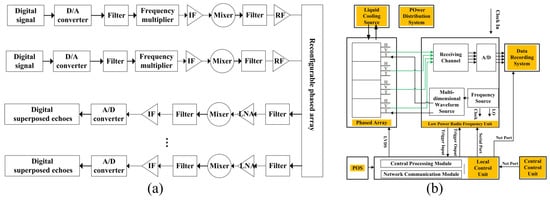 MIMO RF configuration for joint wireless communication and SAR proposed in [64]. (a) Signal flow diagram. (b) MIMO radar system architecture. Copyright IEEE.