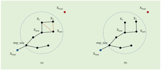 A schematic diagram of the RRT* algorithm: (a) initial wiring setup; (b) rewire.
