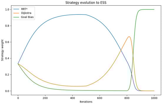 The tuning strategy for the evolutionary game is outlined as follows: At the beginning of the exploration phase, the RRT* strategy takes precedence, facilitating rapid global expansion to explore the unknown environment and ensure comprehensive path coverage. During this phase, the weights assigned to Dijkstra and Goal Bias are kept low. As the search process progresses, the influence of Dijkstra’s algorithm gradually increases to improve the quality of the path. This enhancement is achieved by optimizing the connections between critical points on the path, utilizing the algorithm’s precise capability to find the shortest route. Toward the end of the exploration, the weight assigned to the Goal Bias strategy is significantly increased, which helps the search process converge rapidly toward the target point. This method not only shortens the path length but also reduces the computational time. The system can gradually converge to a final adaptive steady state, where the strategy combinations become balanced and an efficient path is established. From the perspective of system theory, the iteration of this algorithm treats the behavior of group strategies as a dynamic system. During this process, each strategy’s behavior and its relationship with the group are depicted by the principle of time irreversibility. This approach leads to the establishment of a final strategy that achieves the target goal without interference from other strategies. Compared to the Nash equilibrium, this method demonstrates absolute robustness and aligns with the ESS equilibrium, as illustrated in the accompanying Figure 3.
