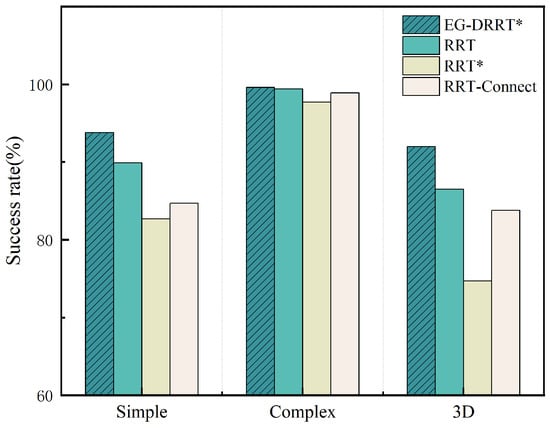 Figure 4 compares the success rates of four algorithms in simple, complex, and 3D environments. EG-DRRT* achieves high success rates across these different environments, particularly in simple and 3D scenarios. In contrast, the traditional RRT, RRT*, and RRT-Connect algorithms significantly decrease success rates in high-complexity situations, indicating that they are less robust when dealing with complex environments. Meanwhile, EG-DRRT* demonstrates a stronger ability to adapt.