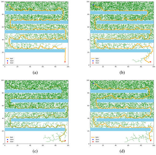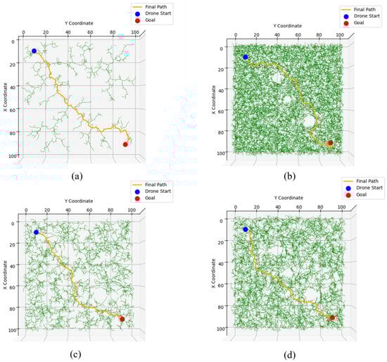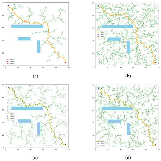 Path diagrams of four algorithms: (a) EG-DRRT*, (b) RRT, (c) RRT*, and (d) RRT-Connect in a complex environment.