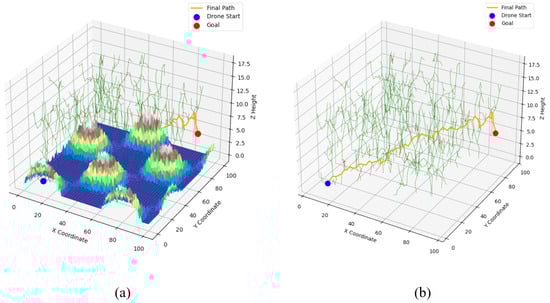 The EG-DRRT* path in a 3D environment: (a) displayed obstacles; (b) concealed obstacles.