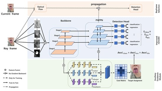 A fast tongue detection model, TD-DFP, based on lightweight object detection and deep feature propagation was proposed to achieve the real-time tongue detection of video streams. The overall framework of TD-DFP is shown in Figure 2, and mainly includes three parts: tongue detection based on improved NanoDet, auxiliary training based on knowledge distillation, and a keyframe detection module based on the inter frame difference. (1) In the process of tongue detection, the frame difference method is first used to select appropriate keyframes, and these keyframe images are converted into four channel images of R, G, B, and V. Then, the NanoDet network with a layered convolution module is used to predict the category and position of the tongue region in the image. (2) In order to further improve detection performance, a knowledge distillation-based grouping attribute auxiliary guidance module is introduced, and a multi-path convolutional neural network designed to extract unique features, such as color, shape, texture, etc., of keyframe tongue images is used. (3) The feature optical flow map between non-keyframes and keyframes of the tongue body image is calculated. The features of the keyframes are aligned and propagated to the non-keyframes through the optical flow map. After this, the detection head outputs the tongue body detection boxes in the keyframe and non-keyframe images.
