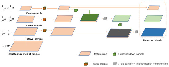 In the PANet Feature Pyramid Network (PAFPN), the network module in GhostNet [18] is used as the module for processing feature fusion between multiple layers. The basic structural unit consists of a set of depth-wise convolutions of 1 × 1 convolutions and 3 × 3 depth-wise convolutions, with very small parameters and computational complexity. The fusion process of the feature pyramid is shown in Figure 4, where down-sampling is used to reduce the dimensionality of the input feature map. The tongue image feature maps scaled to different scales are fused through concatenation, and then a composite operation of up-sampling, skip-connection, and convolution is used to achieve the combination of low-level tongue image features and high-level semantic information. Finally, the output multi-scale feature maps are fed into the detection head of the model for subsequent tongue detection tasks.