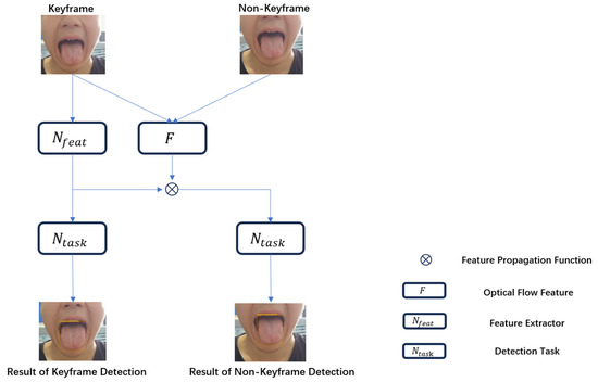 In Equation (14), is the feature map of the keyframes. is the optical flow field from non-key feature maps to key feature maps. is the spatial size and channel dimensions of different feature maps between keyframes and non-keyframes. is a warp operation. This operation utilizes a relatively lightweight optical flow network and warp operation to replace the original feature extraction of each tongue image frame to obtain corresponding features, saving computation and improving model inference speed.