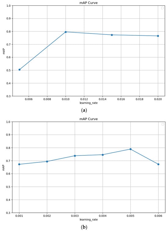Here, we discuss the hyperparameters of the model, including learning rate, weight decay, and loss function hyperparameters. The experiment selects the optimal values of other parameters, which remain unchanged. The learning rate parameter experiment is shown in Figure 6a. During the training process, the Adam optimizer was selected as the optimizer. With other settings remaining unchanged, the model achieved the best mAP value of 0.796 on the test set with a learning rate of 0.001. The Adam optimizer attenuation weight experiment is shown in Figure 6b, with the learning rate set to the optimal 0.01. From Figure 6b, it can be seen that the optimal weight decay of the proposed algorithm is 0.005. When the coefficient is greater or less than 0.005, the mAP value of the model’s object detection on the test set decreases, and the detection performance of the model decreases.