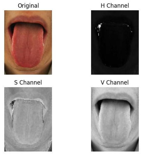 To further support this opinion, Figure 7 is presented to show an example of the original RGB tongue picture and the H, S, and V channels of the corresponding HSV image. It can be seen that the V channel consists of the clearest tongue body region.