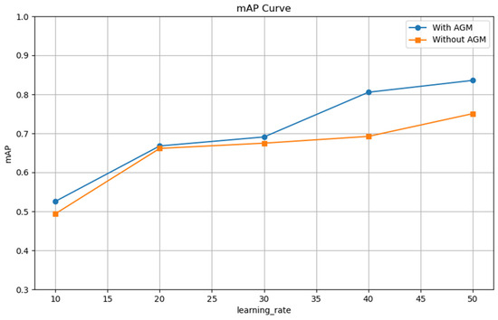 Experimental results of the AGM. The blue line shows that the mAP varies when the model is trained with/without the AGM during training.