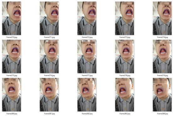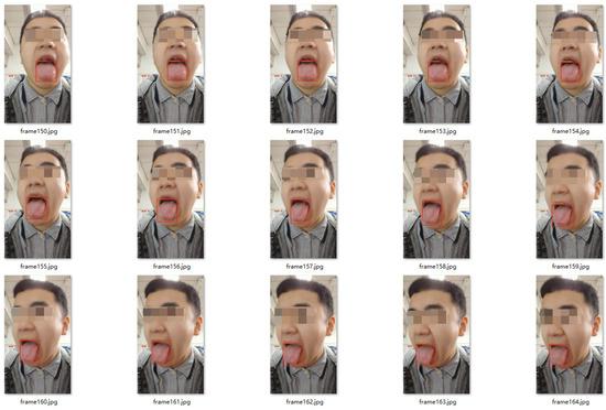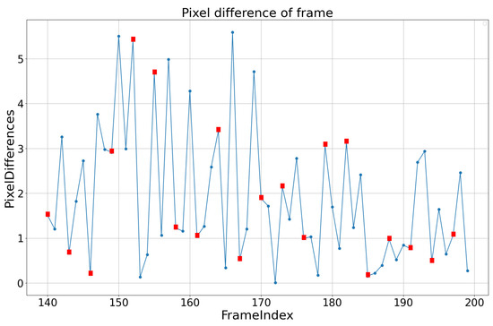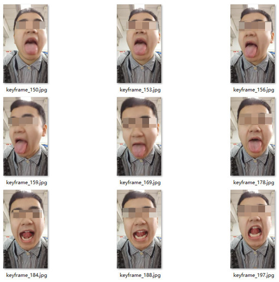 To further validate the effectiveness of the keyframe selection strategy in tongue videos, a study of the frames of videos was conducted. When performing video keyframe detection, an 11 s video stream with a total of 339 frames was selected for detection. The optical flow selection algorithm was used for keyframe extraction, and parts of keyframes were extracted, as shown in Figure 9. The pixel differences between adjacent frames were calculated as shown in Figure 10, with the horizontal axis representing the video frame number and the vertical axis representing the average pixel difference between adjacent frames. The red dots in Figure 10 are the keyframes selected by keyframe selection strategies at an interval of 3. There is a certain overlap between the frame number and keyframe number of values with significant differences. The result shows the effectiveness of a simple keyframe selection strategy.