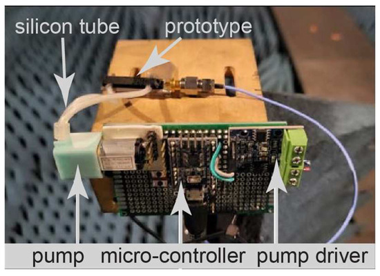 However, it was not until 2020 that the concept of a position-agile LM-FAS prototype was reported [3]. It offers a unique approach to FAS by utilizing the flexibility of liquid metals like gallium alloys to mobilize the radiating position. The measurement setup of a pump-driven LM-FAS is shown in Figure 1. The latest LM-FAS described in [35] comprises a PCB substrate with a conductive ground plane on the bottom, a surface wave launcher connected to a K-type RF connector, a 3D-printed fluid container with embedded fluid channels, and a liquid-metal radiator within the channel. The surface wave launcher pattern is laser-engraved onto one end of a Rogers 5880 microwave dielectric substrate (εr = 2.2, thickness = 0.787 mm, and tan δ = 0.0009 at 10 GHz). The fluid container, fabricated using resin-based projection micro-stereolithography (epoxy resin, εr = 4.0, x-y-z printing resolution = 0.01 mm), contains the fluid channels that guide the liquid-metal radiator’s movement. While metallic or dielectric materials are viable radiator options, Galinstan liquid metal (electrical conductivity = 3.46 × 106 S/m, thermal conductivity = 16.5 W/(K·m), material density = 6440 kg/m3, thermal diffusivity = 8.65578 × 10−6 m2/s) is chosen for its superior scattering capability. A 3V peristaltic micro-pump (11.9 mm ø × 13.9 mm ø × 32.9 mm3) [34], connected via thin silicon tubes, controls the liquid-metal radiator’s movement by pumping air in or out through the container’s inlets/outlets. For precise control, the inlets/outlets can be connected to a fluid control system designed for lab-on-a-chip devices [35]. Pump-free electrowetting techniques, capable of continuously traversing the fluid radiator at speeds up to 10 mm/s, could also be employed [36]. If the precise control system is available, the radiators in LM-FAS can basically be traversed continuously inside the fluid channels, giving a huge number of radiating positions.