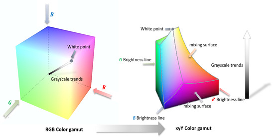 where R denotes the luminance associated with the input red primary color, while signifies the luminance of the red primary color within the display system, and represents the electro-optical transfer function. Through this process, the conversion of linear light signals is generated by the device into nonlinear signals that align with human visual perception [12]. Building upon this foundation, nonlinear colored lights are employed for the purpose of color mixing [13]. Based on the aforementioned information, the expression for the color gamut white balance is articulated as follows:
