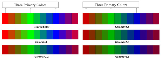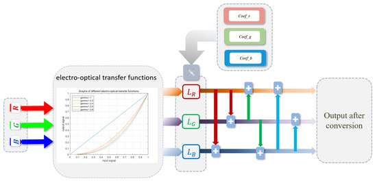 According to Grassmann’s law of color matching, which is fundamental to the field of colorimetry, a wide array of colors observed in nature can be synthesized. Based on this principle, a specific white balance is established as a standard reference for calculating the relative luminance units of the three primary colors [10]. Consequently, any light within the visible spectrum can be generated by combining varying proportions of these three primary color lights. The specific quantities of each primary color required to produce different colors of light are referred to as the tristimulus values of the colored light [11]. In the practical application of this color mixing on display terminals, it is essential to first perform nonlinear processing on the colored light signals, as illustrated in the following equation: