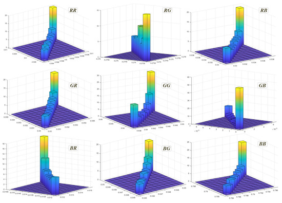 This study investigates the influence of quantization errors generated by the electro-optical transfer function on the boundaries of the target color gamut during the color gamut conversion process. To address the issue of overflow distortion, which arises when the target color gamut is not fully encompassed within the original gamut space, the conversion from the wide color gamut (BT.2020) to sRGB has been selected [20]. Initially, 100 color points within an acceptable color difference range of the three primary color coordinate points are randomly selected in proximity to the primary color coordinates of the BT.2020 color gamut to establish the original color gamut families. The aim is to analyze the characteristic patterns of the G matrix families when these color gamut families are converted to the narrower sRGB gamut, thereby reducing the influence of the G matrix during this conversion. This analysis serves as a critical foundation for enhancing the focus on the key parameter of the electro-optical transfer function. According to the conversion equation presented in Section 2, the color gamut conversion matrix for each pixel is determined by nine parameters. These parameters depend on the original color gamut of the primary colors and the designated target conversion color gamut. The parameters are discrete, with values in the range of [0, 1]. The specific coefficients—RR, RG, RB, GR, GG, GB, BR, BG, and BB—within each G matrix have been identified, and distribution diagrams for these coefficients across the matrix families are provided in Figure 4.