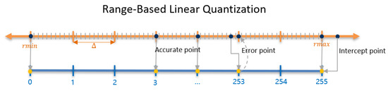 In contemporary display technology, display terminals are composed of individual pixel points. During the process of color gamut conversion at the display terminal, the color difference function model for each pixel point remains constant. A complete set of color gamut conversion parameters consists of nine distinct parameters associated with each pixel point. For instance, the red conversion parameters for a given pixel point can be expressed as . The color gamut conversion matrix for each pixel point is intrinsically linked to these nine parameters, whose values are contingent upon the original color gamut of the primary colors and the specified target conversion color gamut. It is important to note that these nine parameters are discrete, with their value range constrained to [0, 1] [21]. When executing color gamut conversion calculations, the discrete nature of the control system necessitates the quantization of the computed data. The quantization process is shown in Figure 5.