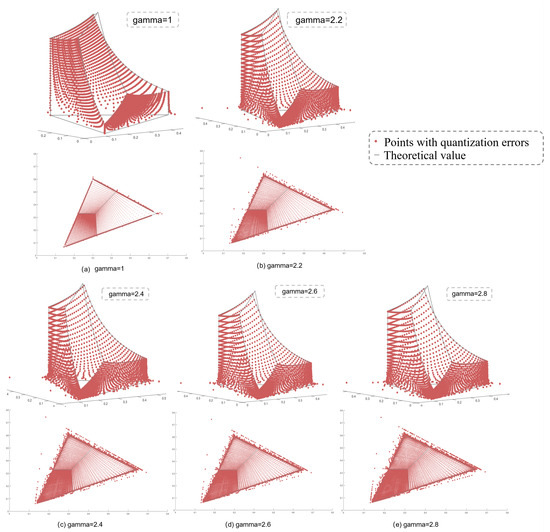 This observation suggests that as the parameters of the electro-optic transfer function increase, the ratio correspondingly increases. In Figure 6, the three-dimensional graph illustrates that nearly all singularities are concentrated in the low-grayscale-levels region, indicating that the effect of control accuracy on the conversion of high-grayscale-levels color spaces is minimal. It is evident that elevated grayscale levels diminish the impact of quantization error on the conversion process. As the parameters of the electrical light transfer function increase, greater emphasis is placed on low grayscale levels during nonlinear transformation. Since low grayscale levels are significantly affected by quantization errors, this results in a more pronounced distortion of the color gamut boundary following color gamut conversion.