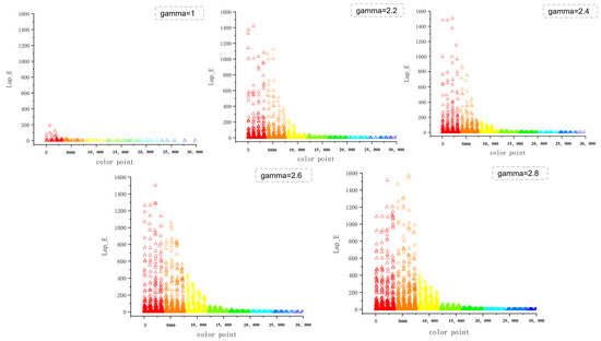 The primary focus of this experiment is on the boundary point sets that exhibit non-convergence. Utilizing the unified description method outlined in Section 3, the values of each parameter within the calculation equation were determined. Initially, the entropy values of the distortion points corresponding to the different electro-optical transfer functions were computed to assess the degree of chaos present among the distortion points. An elevated entropy value signifies an increased level of disorder, which in turn intensifies the effects on conversion accuracy. Table 2 presents the entropy values corresponding to each transfer function. Subsequently, the distribution of the Laplace Operator associated with each transfer function was calculated. An analysis was conducted on the color points located along the peripheries of each color gamut, focusing on the sets of distortion points that did not converge within the volume of the color gamut after undergoing conversion via the transfer function. Utilizing the methodology outlined in Section 3, distortion points exhibiting color differences that exceeded the acceptable tolerance range were identified. The distribution of these distortion points in relation to the electro-optical transfer function is illustrated in the accompanying Figure 7.
