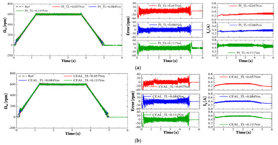 The same reference speed in the form of a ramp profile with different torque levels was used to compare various methods: PI control, CEAL, ASMC, NSMC, and NSMCEAL, as shown in Figure 20a–e, respectively. Figure 20e,f,g illustrate the NSMCEAL control method based on different sliding surfaces: CSMS, DISMS, and with the DOB + LPF (disturbance observer + low-pass filter).